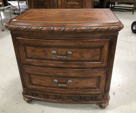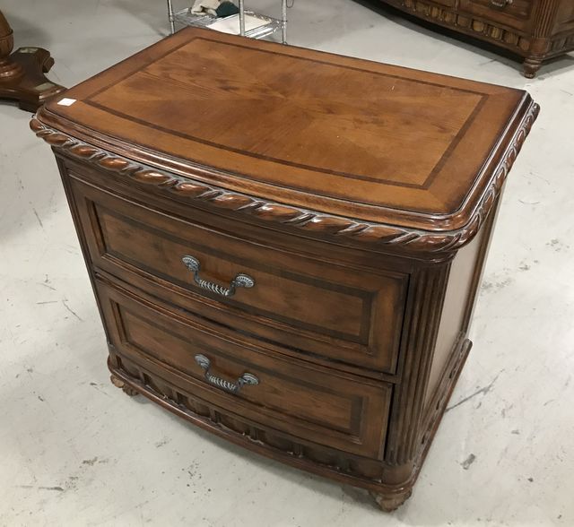 Wynwood Furniture Company Large Oak Nightstand, two drawers, inlaid banded, good condition, 32"h., 34"w., 22"d. Wynwood Furniture Company Large Oak Nightstand, two drawers, inlaid banded, good condition, 32"h., 34"w., 22"d.