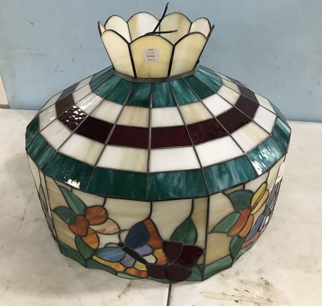 Applebee's Leaded Stained Glass Light Fixture, hanging light fixture, good condition, 13"h., 19"dia. Butterfly design. Applebee's Leaded Stained Glass Light Fixture, hanging light fixture, good condition, 13"h., 19"dia. Butterfly design.