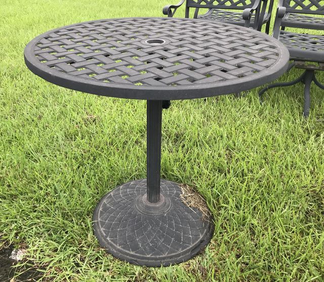 Round Cast Metal Patio Pedestal Table, comes with umbrella, woven pattern top, good condition. Small size round top. Round Cast Metal Patio Pedestal Table, comes with umbrella, woven pattern top, good condition. Small size round top.