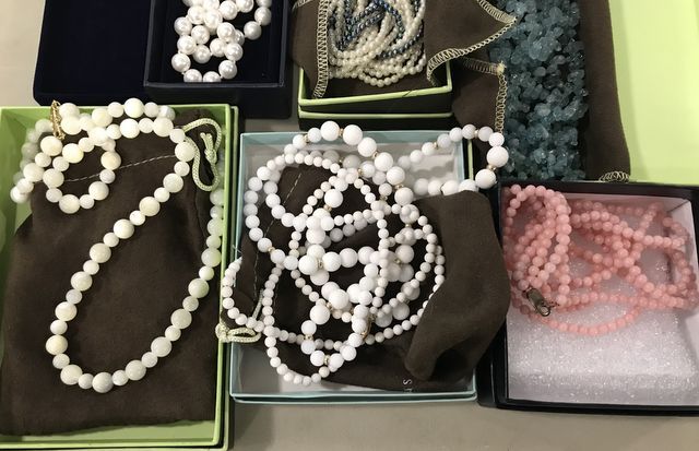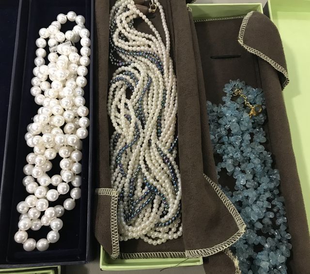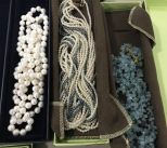 Four colored Faux pearl necklaces, blue stone necklace. Four colored Faux pearl necklaces, blue stone necklace.