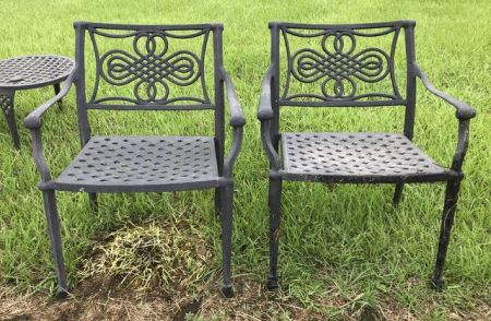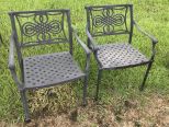 Pair of Cast Metal Patio Arm Chairs, woven pattern seat, good condition. Pair of Cast Metal Patio Arm Chairs, woven pattern seat, good condition.