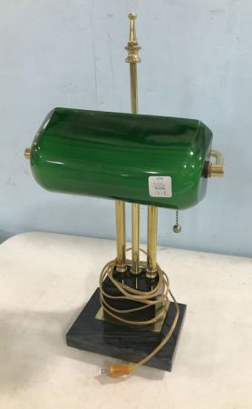 Traditional Green Shade Banker's Lamp, brass frame, faux marble base, 20"h. Traditional Green Shade Banker's Lamp, brass frame, faux marble base, 20"h.