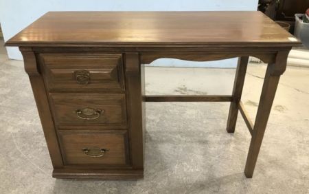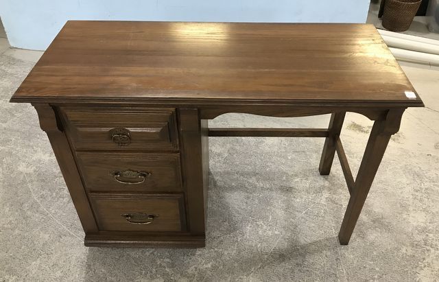 Vintage Oak Kneehole Writing Desk, three side drawers, good condition, 30"h., 44"w., 18"d., minor wear on top. Vintage Oak Kneehole Writing Desk, three side drawers, good condition, 30"h., 44"w., 18"d., minor wear on top.