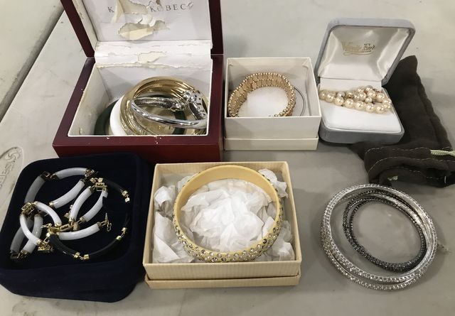 Group of Decorative Costume Jewelry Bracelets, assorted styles and colors, faux pearl, clear stone with silver tone frames, like new. Group of Decorative Costume Jewelry Bracelets, assorted styles and colors, faux pearl, clear stone with silver tone frames, like new.