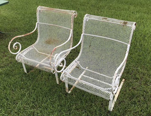 Two White Wrought Iron Rocking Chairs, diamond pattern, has some wear and small dents. Two White Wrought Iron Rocking Chairs, diamond pattern, has some wear and small dents.
