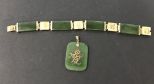 Asian style pendant and bracelet, gold plate over sterling, stone appears to be green glass to imitate jade. Asian style pendant and bracelet, gold plate over sterling, stone appears to be green glass to imitate jade.