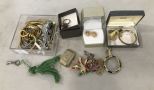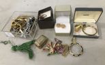 Gold tone necklaces, bracelets, earrings, bird pin, magnify glass necklace, vintage dinner ring. Gold tone necklaces, bracelets, earrings, bird pin, magnify glass necklace, vintage dinner ring.
