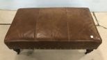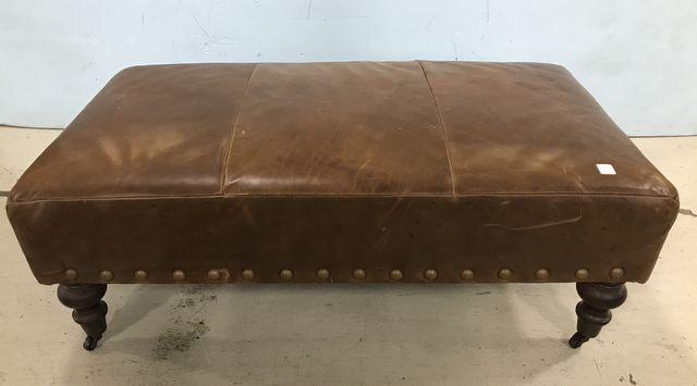 Sam Moore Furniture Company Leather Ottoman, on casters, used condition, no tear, 15"h., 43"w., 25"d. Sam Moore Furniture Company Leather Ottoman, on casters, used condition, no tear, 15"h., 43"w., 25"d.