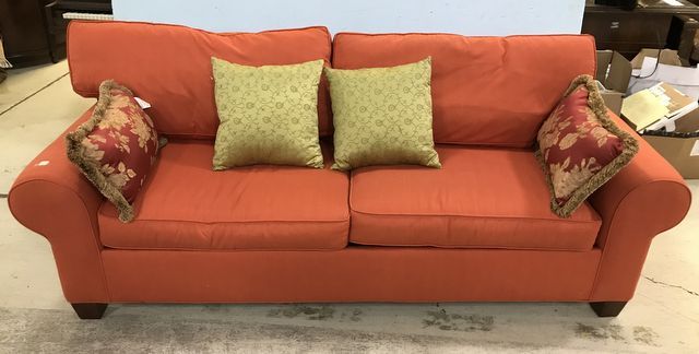 Modern orange sleeper sofa, two cushion, not to heavy, with throw pillow, 7'. Modern orange sleeper sofa, two cushion, not to heavy, with throw pillow, 7'.