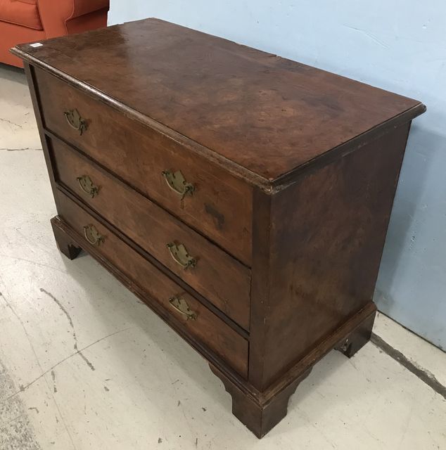 Three Drawer Early Walnut Federal Chest, burl, three drawers, has wear with missing veneer spots, 25"h., 36"w., 18"d. Three Drawer Early Walnut Federal Chest, burl, three drawers, has wear with missing veneer spots, 25"h., 36"w., 18"d.