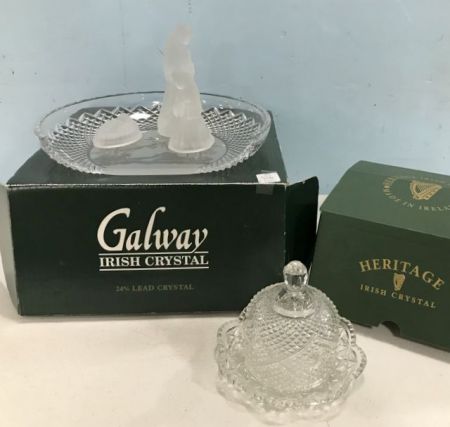 Galway Irish crystal nativity back drop and figurines, Heritage Butter dish. Galway Irish crystal nativity back drop and figurines, Heritage Butter dish.