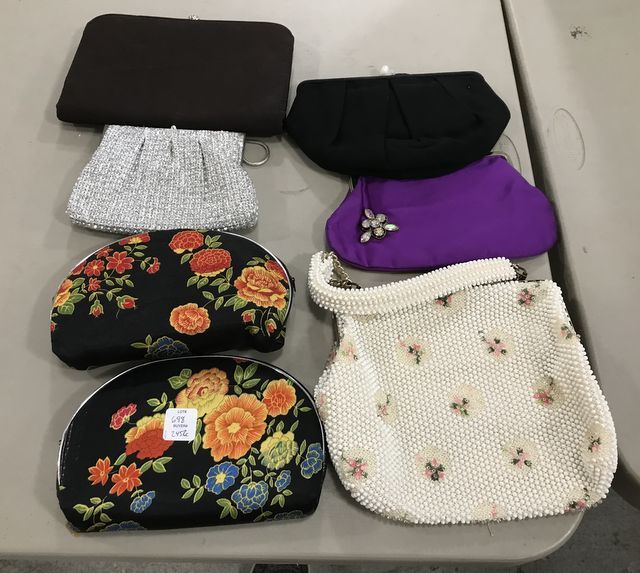 Group of Makeup and Carrying Purses, beaded, floral, silver color, 7 total. Group of Makeup and Carrying Purses, beaded, floral, silver color, 7 total.