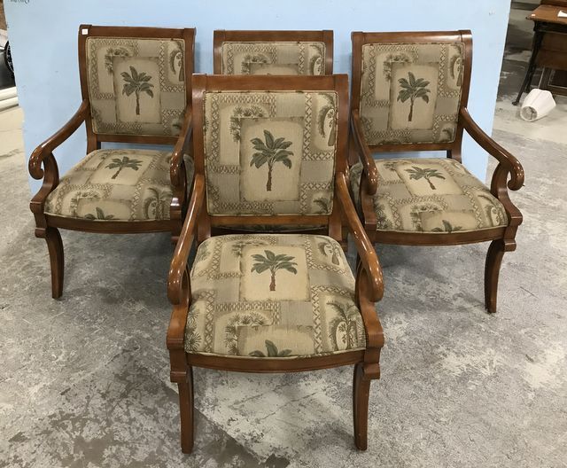 Four Modern French Style Arm Chairs, palm tree upholstery, maple, minor finish wear, 39"h. Four Modern French Style Arm Chairs, palm tree upholstery, maple, minor finish wear, 39"h.