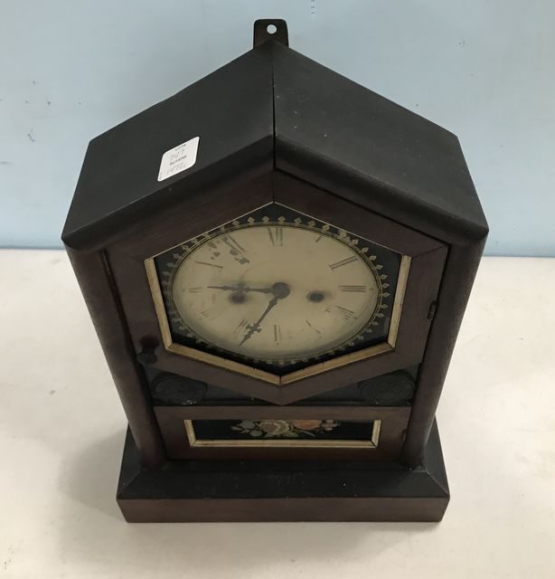 Antique Empire Style Mantle Clock, floral etched glass, has key and pendulum, does not work, 16"h., 10"w. Antique Empire Style Mantle Clock, floral etched glass, has key and pendulum, does not work, 16"h., 10"w.