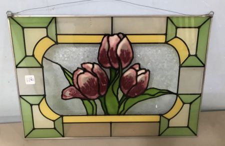 Painted glass, stain glass like, decor hanging panel, 14"h., 20"w. Painted glass, stain glass like, decor hanging panel, 14"h., 20"w.