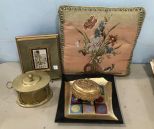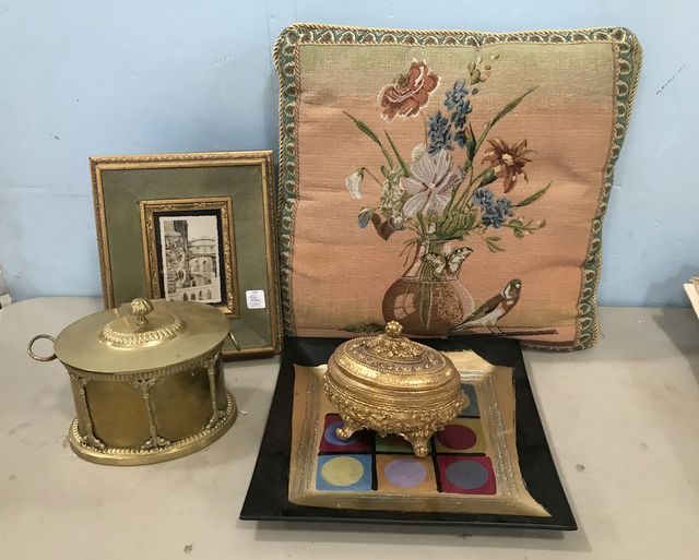 Hand Painted Square Glass Plate, India solid brass trinket box, gold gilt resin trinket box, decorative small framed picture, Still life upholstery throw pillow. Hand Painted Square Glass Plate, India solid brass trinket box, gold gilt resin trinket box, decorative small framed picture, Still life upholstery throw pillow.