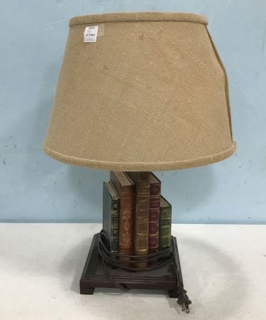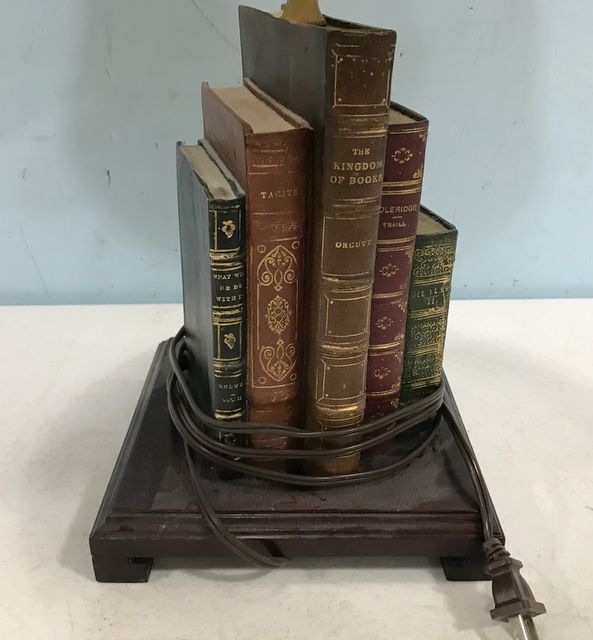 Decor Leather Book Style Desk Lamp, wood base, needs new shade, 20"h. Decor Leather Book Style Desk Lamp, wood base, needs new shade, 20"h.