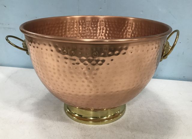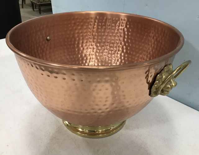 Modern brass color planter, lion head handles, 10"h., 16"dia. Modern brass color planter, lion head handles, 10"h., 16"dia.