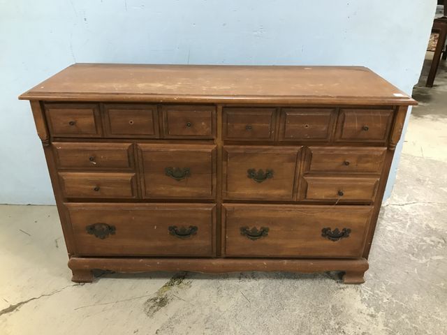 Early American Style Ward Furniture Company Double Dresser, 6 drawers, worn finish, 32"h., 50"w., 18"d. Early American Style Ward Furniture Company Double Dresser, 6 drawers, worn finish, 32"h., 50"w., 18"d.