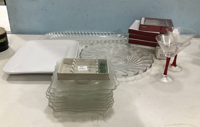 Swirl pattern glass tray and charger, collection of porcelain name plates, etched glass plates, stems, ceramic tray, butter knives. Swirl pattern glass tray and charger, collection of porcelain name plates, etched glass plates, stems, ceramic tray, butter knives.