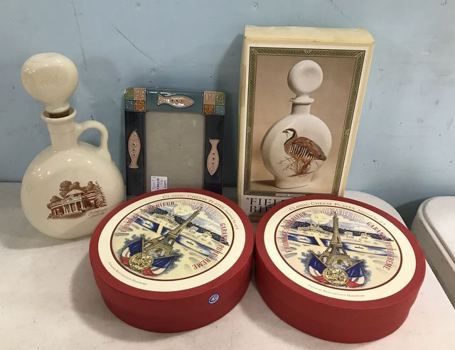 Collectible Decanters, Fish Photo Frame, and Camembert Cheese Plate Collection. Collectible Decanters, Fish Photo Frame, and Camembert Cheese Plate Collection.