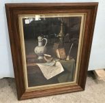 Framed still life print of Delft pitcher, flute, music, ink pen, 30"h., 23"w. Framed still life print of Delft pitcher, flute, music, ink pen, 30"h., 23"w.