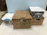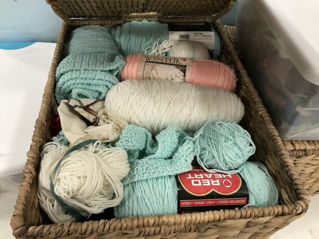 Group of Yarns and Sewing Thread, two plastic containers, two woven baskets full. Group of Yarns and Sewing Thread, two plastic containers, two woven baskets full.