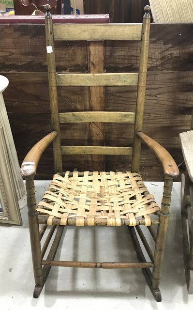 Early Shaker Slat back rocker, oak, hand made, split oak woven seat, does need tightening, 43"h. Early Shaker Slat back rocker, oak, hand made, split oak woven seat, does need tightening, 43"h.