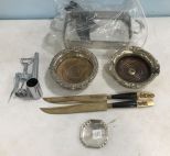 1038 Silver Plate Casserole Stand, Ornate Silver Plate Wine Coasters, Ashtray, and Brass Carving Knives