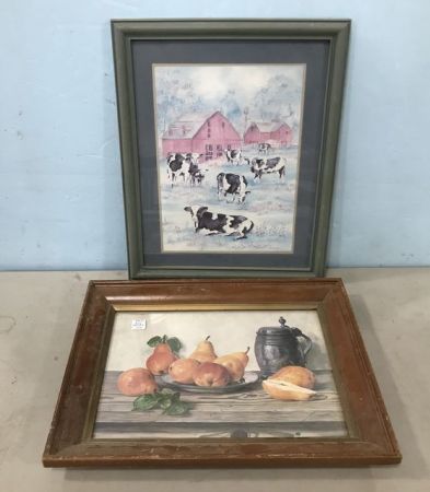 Vintage still life print with artist signature, 16"h., 19"w., framed dairy cows print. Vintage still life print with artist signature, 16"h., 19"w., framed dairy cows print.