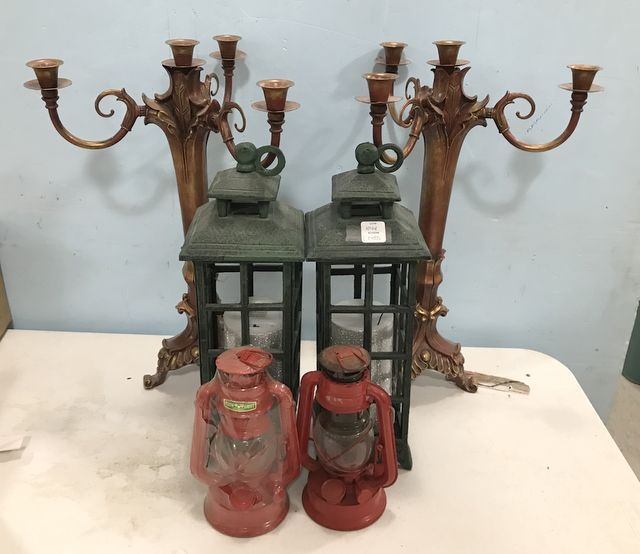 Pair of black painted metal lanterns, pair of Moon Light red lanterns, and Pair of Metal antique gold gilt candelabras 19"h. Pair of black painted metal lanterns, pair of Moon Light red lanterns, and Pair of Metal antique gold gilt candelabras 19"h.
