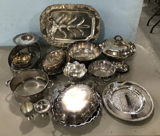 Tree Life silver plate tray, missing foot, Paul Revere bowl, silver plate bowls, creamer, trays. Tree Life silver plate tray, missing foot, Paul Revere bowl, silver plate bowls, creamer, trays.