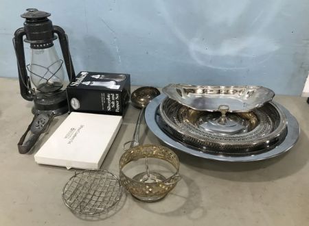 Silver plate round trays, oval dish, ladle, Cranberry set, Salt & Pepper, tongs, pie server, metal lantern. Silver plate round trays, oval dish, ladle, Cranberry set, Salt & Pepper, tongs, pie server, metal lantern.