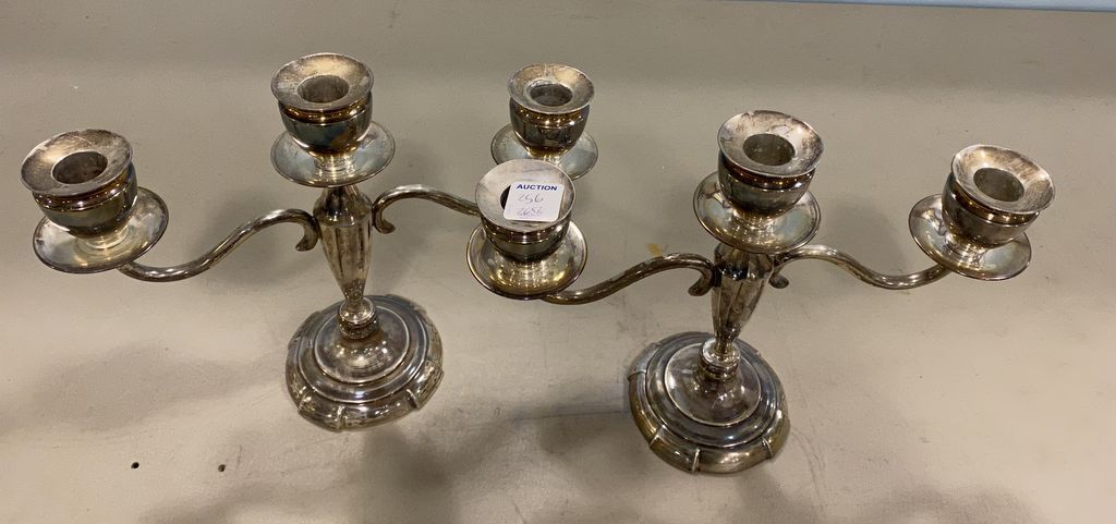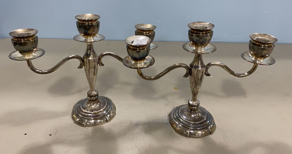 Pair of Sterling Candle Holders, three slot candle holders, marked sterling, weighted, 9"h., 10"w. Pair of Sterling Candle Holders, three slot candle holders, marked sterling, weighted, 9"h., 10"w.