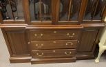 Ethan Allen Cherry Breakfront, two piece, has glass shelves, lighted, good condition, 80"h., 65"w., 18". Ethan Allen Cherry Breakfront, two piece, has glass shelves, lighted, good condition, 80"h., 65"w., 18".