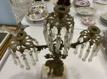 Antique Figural Three Arm Candelabra, metal framed, marble base, water fall prisms, age wear, 18"h., 14"w. Antique Figural Three Arm Candelabra, metal framed, marble base, water fall prisms, age wear, 18"h., 14"w.