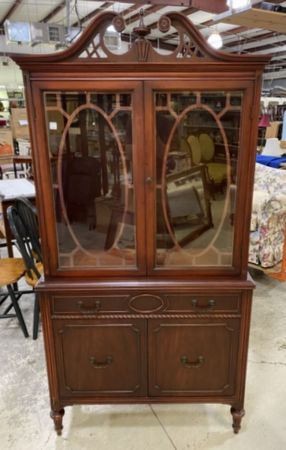20th Century Cherry French Provincial China Cabinet, broken pediment crest, double glass door, single drawer, double door storage, good condition, 74"h., 37"w., 15"d. 20th Century Cherry French Provincial China Cabinet, broken pediment crest, double glass door, single drawer, double door storage, good condition, 74"h., 37"w., 15"d.
