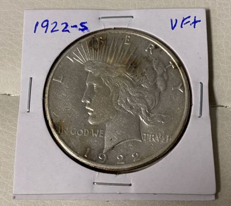1922-S Peace Liberty Dollar VF, in paper case. 1922-S Peace Liberty Dollar VF, in paper case.