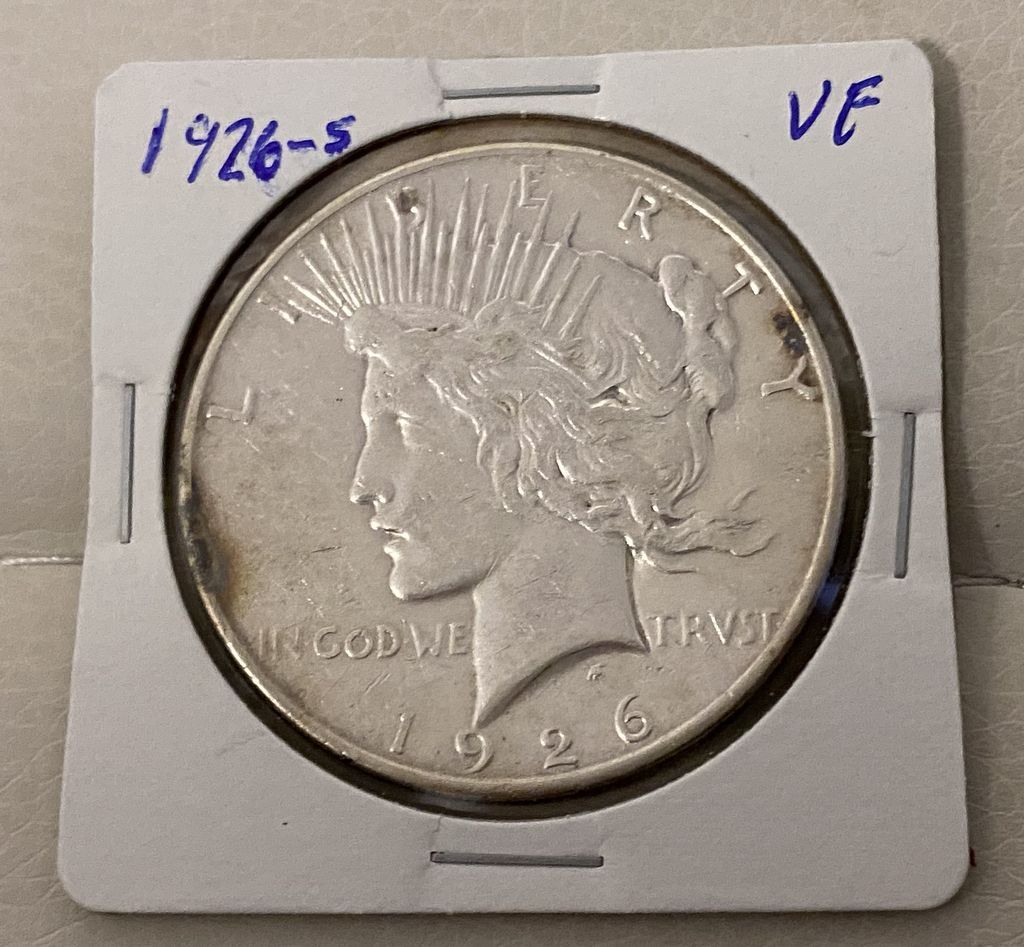 1926-S Peace Liberty Dollar VF, in paper case. 1926-S Peace Liberty Dollar VF, in paper case.