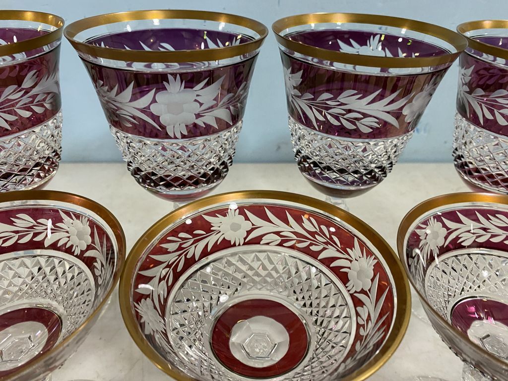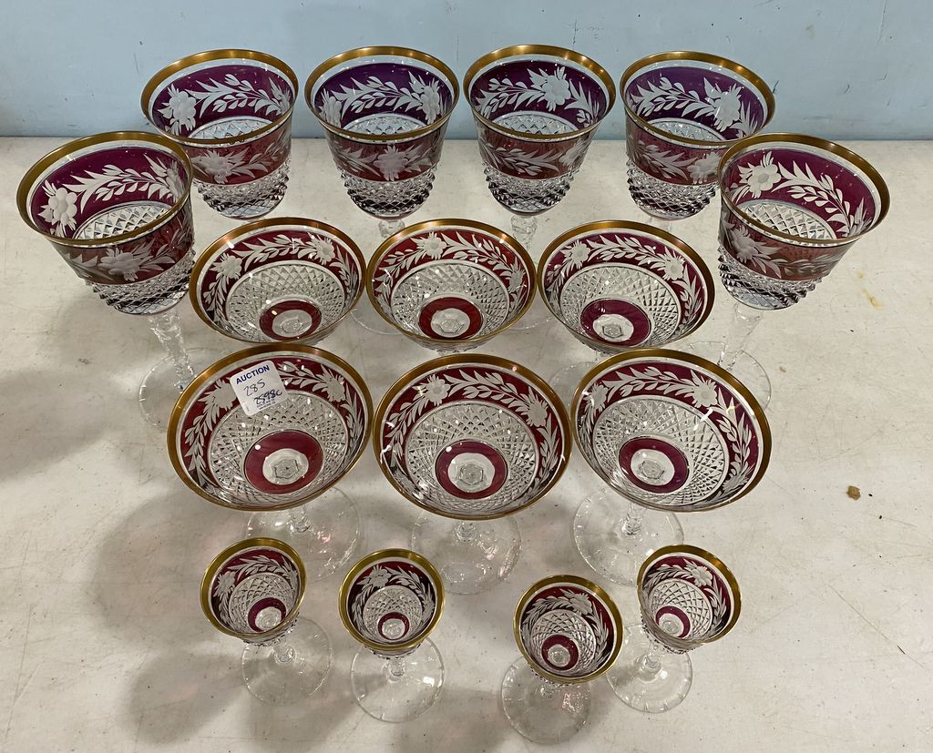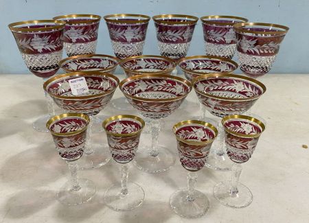 16 Crystal Stemware, cranberry cut to clear, gold rimmed, goblets, sherbets, cordials, one has foot chip. 16 Crystal Stemware, cranberry cut to clear, gold rimmed, goblets, sherbets, cordials, one has foot chip.