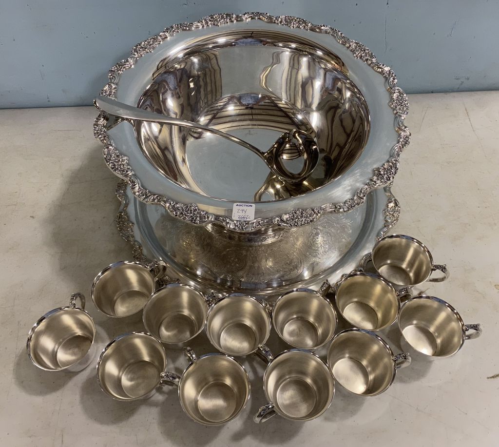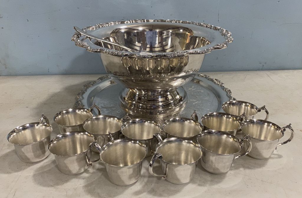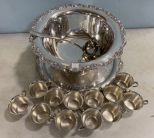Silver Plate Punch Bowl, 8"h., 16"dia., underplate, 12 punch cups, clean condition. Silver Plate Punch Bowl, 8"h., 16"dia., underplate, 12 punch cups, clean condition.