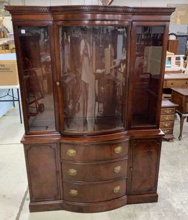 Mahogany Duncan Phyfe China Cabinet, bow glass front door, three drawers, two side doors, light wear, good condition, one piece, two wood shelves, 69"h., 48"w., 14"d. Mahogany Duncan Phyfe China Cabinet, bow glass front door, three drawers, two side doors, light wear, good condition, one piece, two wood shelves, 69"h., 48"w., 14"d.