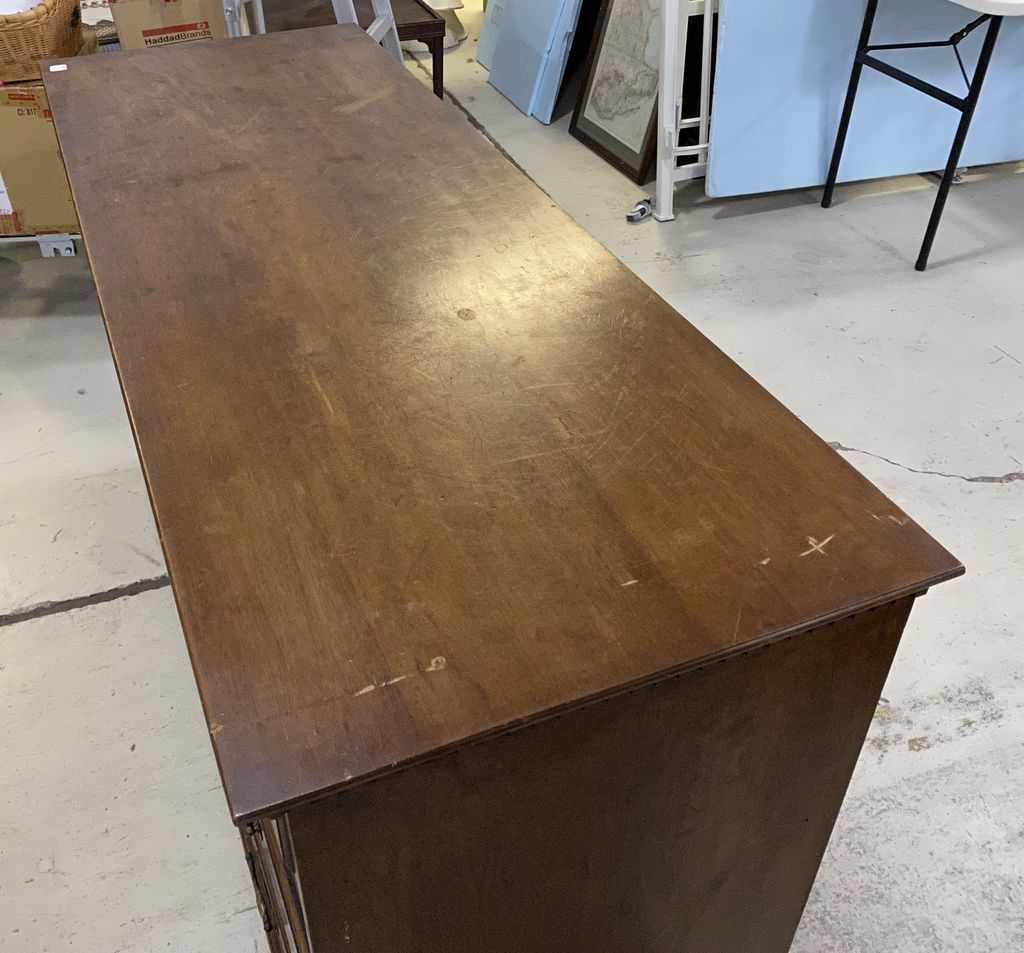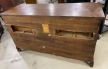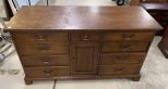 Davis Cabinet Co. Early American Style Buffet, brass pulls, 9 drawers, single door, has scratches on finish, solid piece of furniture, one drawer missing bottom, 34"h., 60"w., 22"d. Davis Cabinet Co. Early American Style Buffet, brass pulls, 9 drawers, single door, has scratches on finish, solid piece of furniture, one drawer missing bottom, 34"h., 60"w., 22"d.