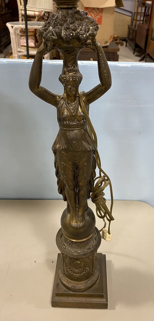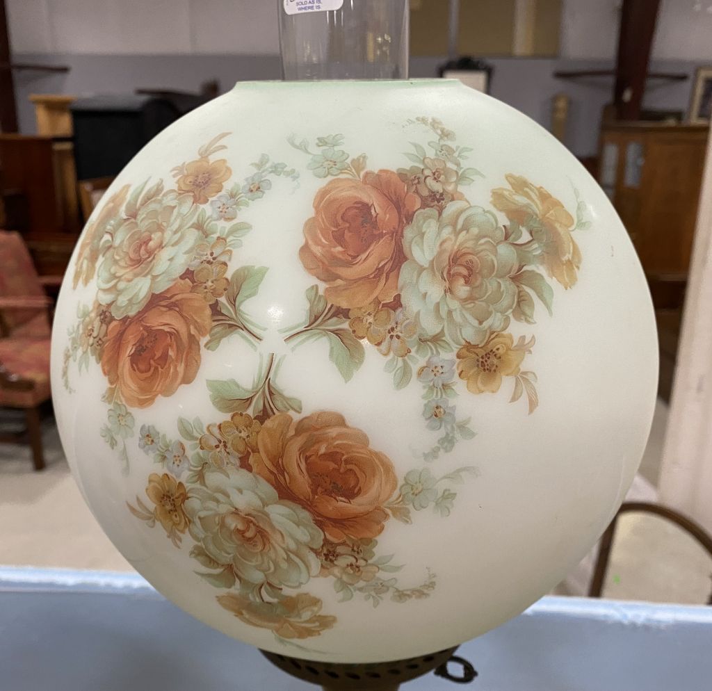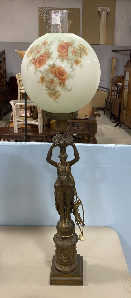 Antique Victorian Style Floral Globe Lamp, lady figure with flower bouquet, brass, glass globe with hurricane shade, light wear, Early 20th Century, 38"h. Antique Victorian Style Floral Globe Lamp, lady figure with flower bouquet, brass, glass globe with hurricane shade, light wear, Early 20th Century, 38"h.