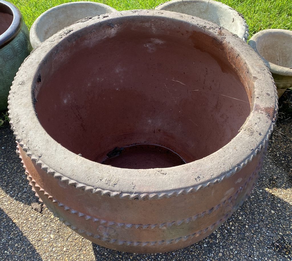 Large Terra Cotta Planter, has design, heavy, good condition 23"h., 32"dia. Large Terra Cotta Planter, has design, heavy, good condition 23"h., 32"dia.