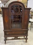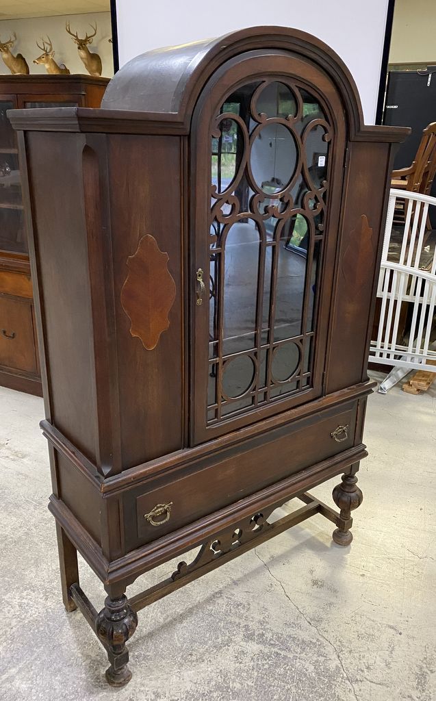 1920's-40's Depression Era China Cabinet, Jacobean style, single door, walnut, single storage drawer, has finish wear, age wear, dome top, 69"h., 42"w., 15"d. 1920's-40's Depression Era China Cabinet, Jacobean style, single door, walnut, single storage drawer, has finish wear, age wear, dome top, 69"h., 42"w., 15"d.