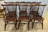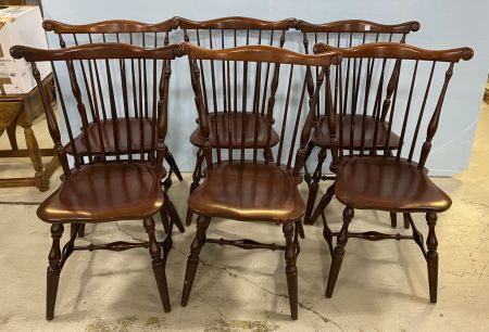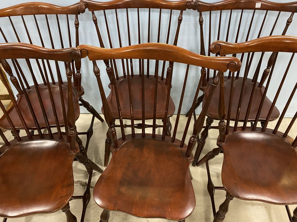 Six Cherry Primitive Style Dining Chairs, spindle back, light wear, Windsor style, includes seat cushion. Six Cherry Primitive Style Dining Chairs, spindle back, light wear, Windsor style, includes seat cushion.