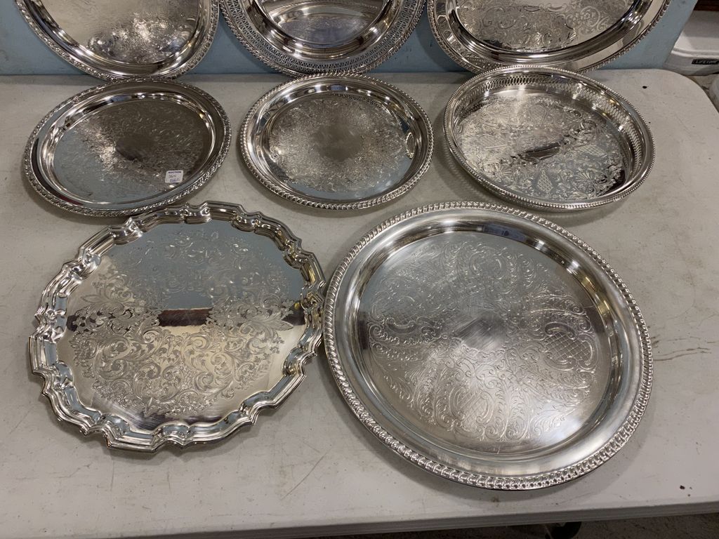 8 Silver Plate Serving Trays, good condition, round trays, oval tray. 8 Silver Plate Serving Trays, good condition, round trays, oval tray.