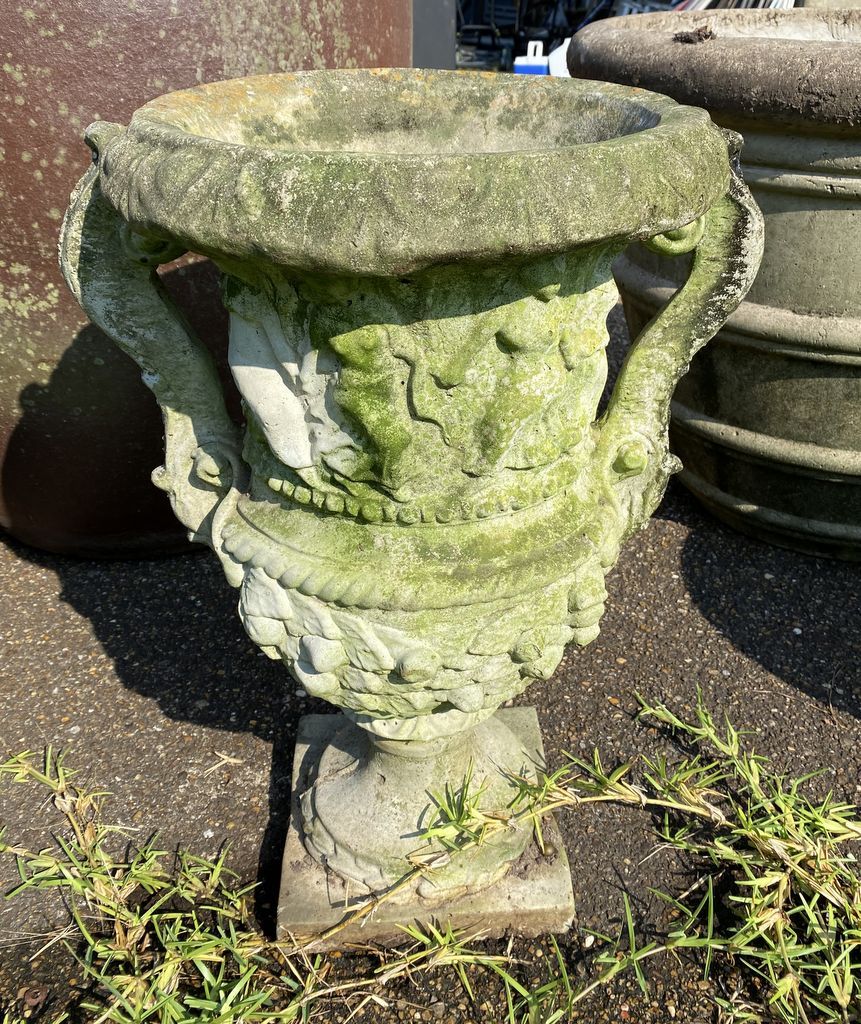 Concrete Outdoor Urn Planter, good condition, weathered finish, 24"h., 16"dia. Concrete Outdoor Urn Planter, good condition, weathered finish, 24"h., 16"dia.