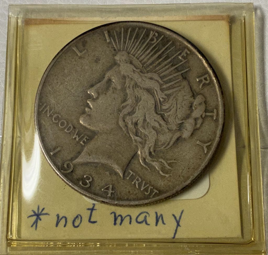 1934-D Peace Liberty Coin, good condition, plastic case. 1934-D Peace Liberty Coin, good condition, plastic case.